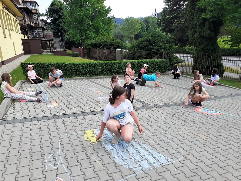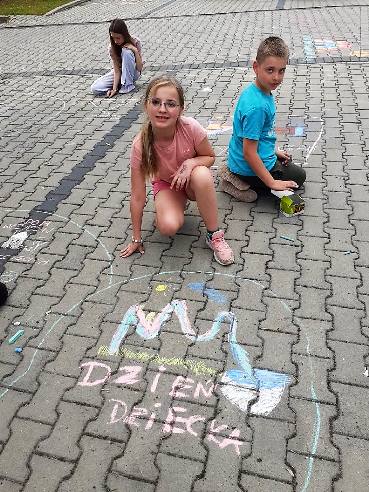 Odbył się również plenerowy konkurs plastyczny, czyli malowanie kredą na asfalcie. Powstały piękne prace przedstawiające dziecięce marzenia. Dzień zakończyliśmy Festiwalem Talentów, w czasie którego dzieci prezentowały swoje zdolności wokalne, muzyczne, taneczne i wiele innych.